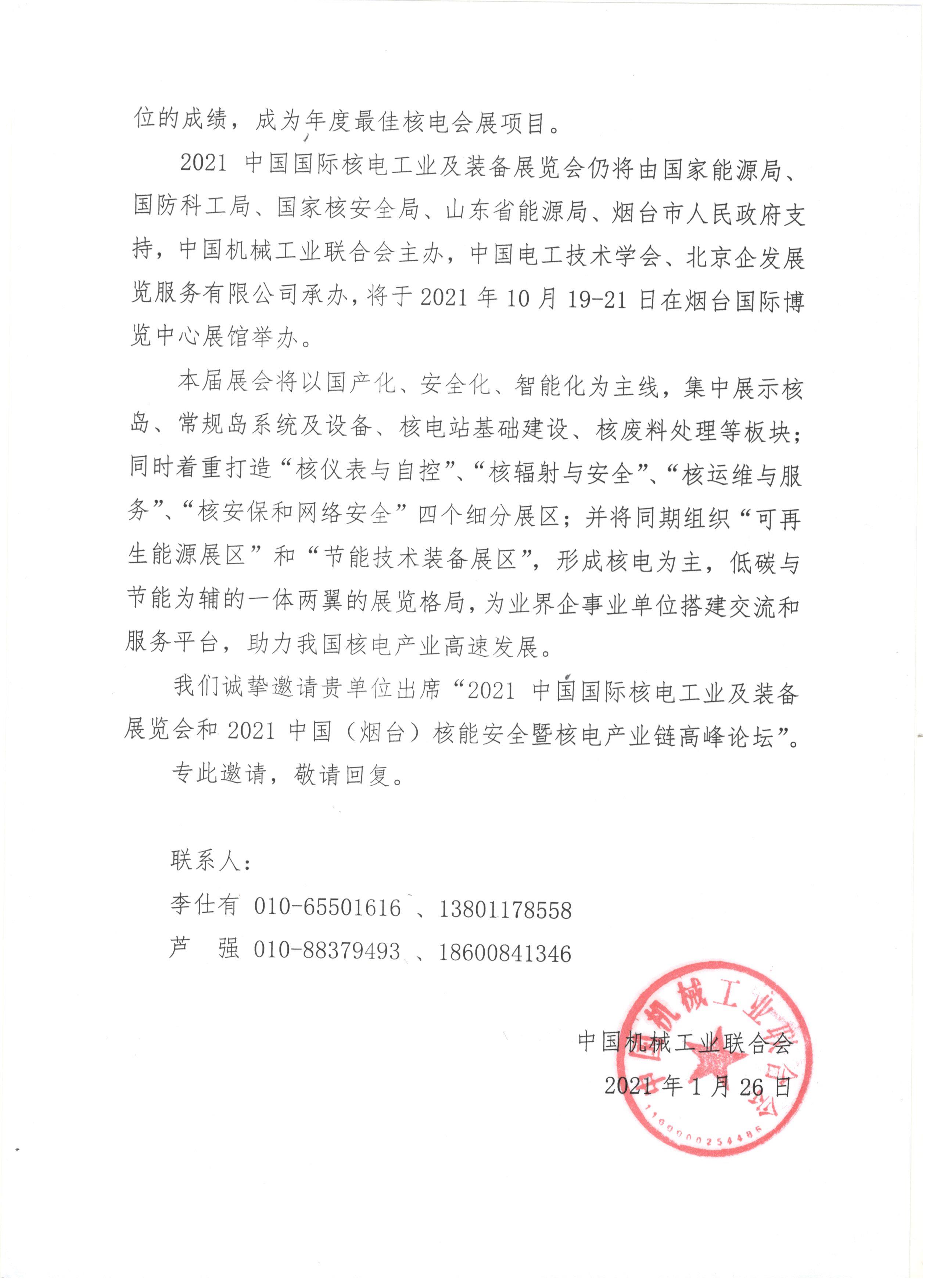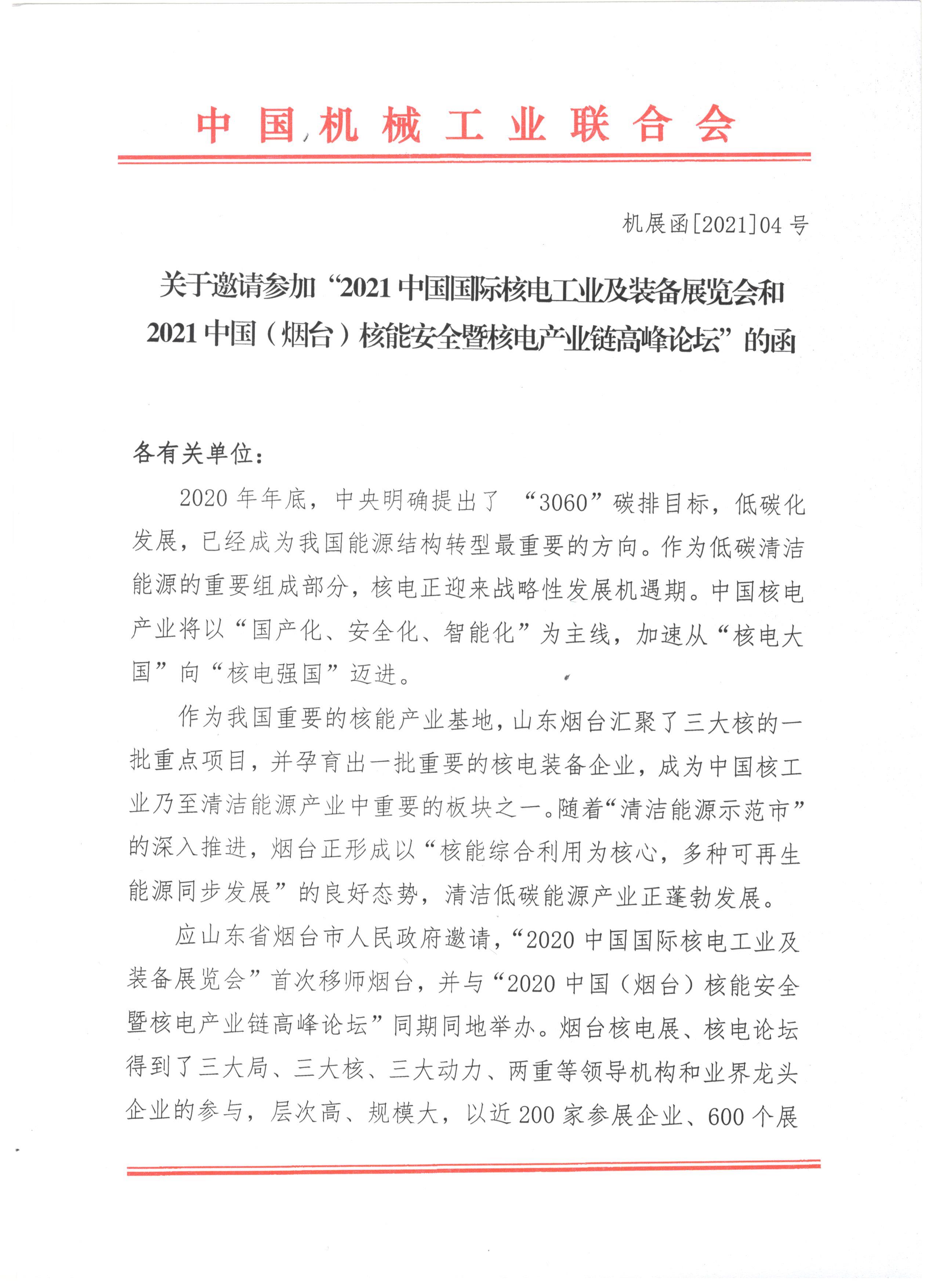 關于邀請參加“2021中國國際核電工業及裝備展覽會和2021中國(煙臺)核能安全暨核電產業鏈高峰論壇”的函