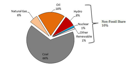 中國的能源消耗具有高污染性。中國是世界上第一能源消耗國,占全球能源耗費總量的20%。盡管自1990年來中國非化工燃料能源來源的占比已經翻番,但化石燃料仍占全國能源消耗的90%,其中2/3的能源來自煤炭。