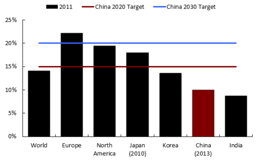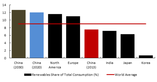 這將在未來幾年發生變化。上個月,中國計劃將來自非化石燃料的能源的占比在到2020年提高到15%。同時也與美國達成協議,承諾將這一比例在2030年時提高到20%。這些承諾將使中國在2020年的時候達到全球非化石能源消耗的平均水平,在2030年達到北美、歐洲和亞洲發達經濟體的水平。